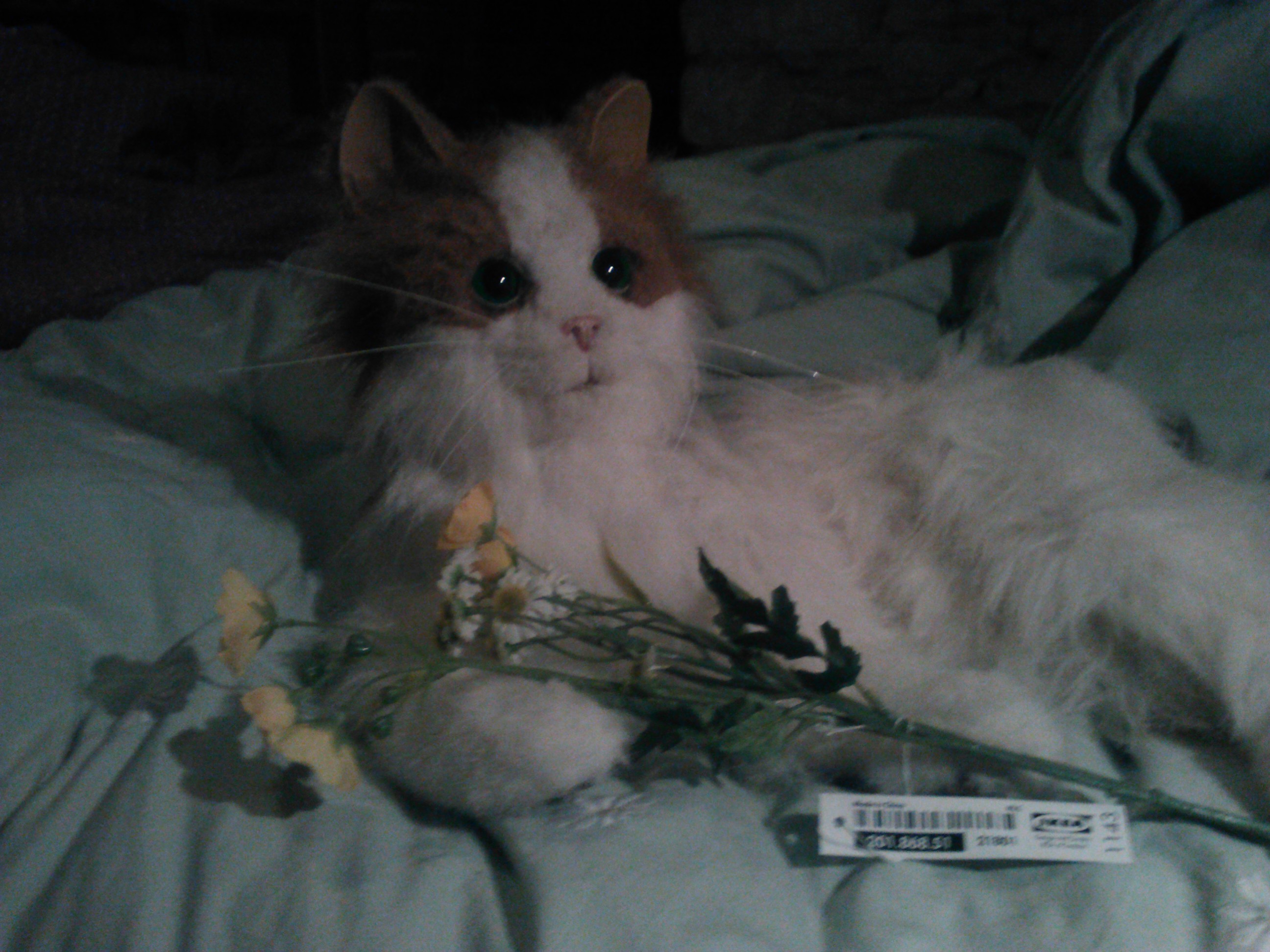 Peering from the top of Laura’s yellow bag is another device of clever artifice: Lulu, her spookily lifelik toy cat. Whever we allow her the luxury of batteries, she purrs and makes subtle little feline moves. She seems an appropriate toy to have brought with us to the land of IKEA make-believe. Lulu is so lifelike that I sometimes place her in public view in our front room, on the windowsill or sofa, to deter burglars. I am surprised that no member of staff (sorry, co-worker) requests we remove her from the store. Nor does any mad old lady reproach us for animal cruelty. (I was once scolded by a stranger for leaving Laura’ lifelike, lifesize toy collie dog in a hot car.)